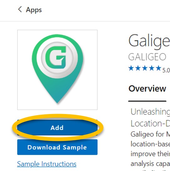 In the AppSource window, type in “galigeo” in search-bar on the top-right.
